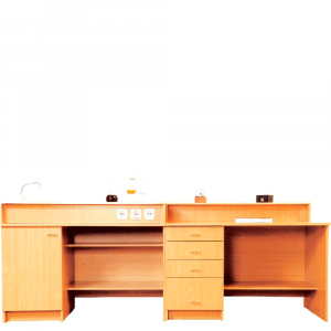 Під стільницею розміщено панель з трьома електричними розетками. Стіл під мийкою обладнано тумбою з дверцятами, в якій монтується система відводу води та хімічних розчинів. З правого боку стіл має відкриту нішу з двома полицями. Спереду він закритий екраном.