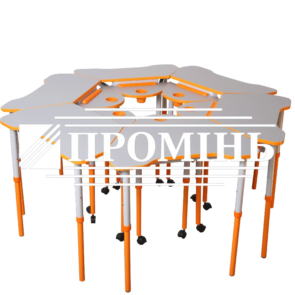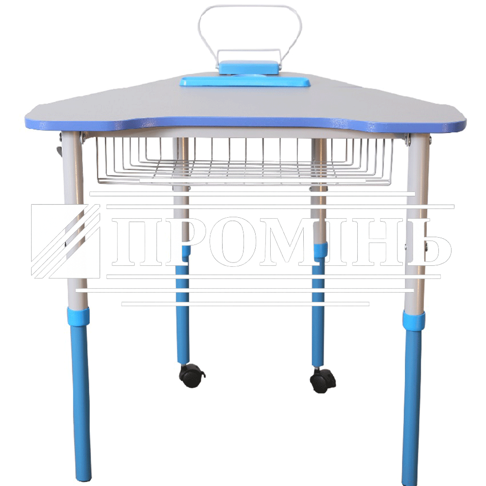 Каркас стола виконаний з труб 25х25х1,2; Ø 27х1,2 та Ø 32х1,2 для зростових груп 3-5 або 4-6. Стіл має 4 ноги-опори – дві передні оснащені роликами, за допомогою яких стіл може легко переміщатися по приміщенню. Регулювання стола по висоті здійснюється за допомогою гвинтових стяжок та рухомих, по відношенню одна до одної, деталей каркасу. Рухомі деталі каркасу з’єднані через пластикову втулку.
